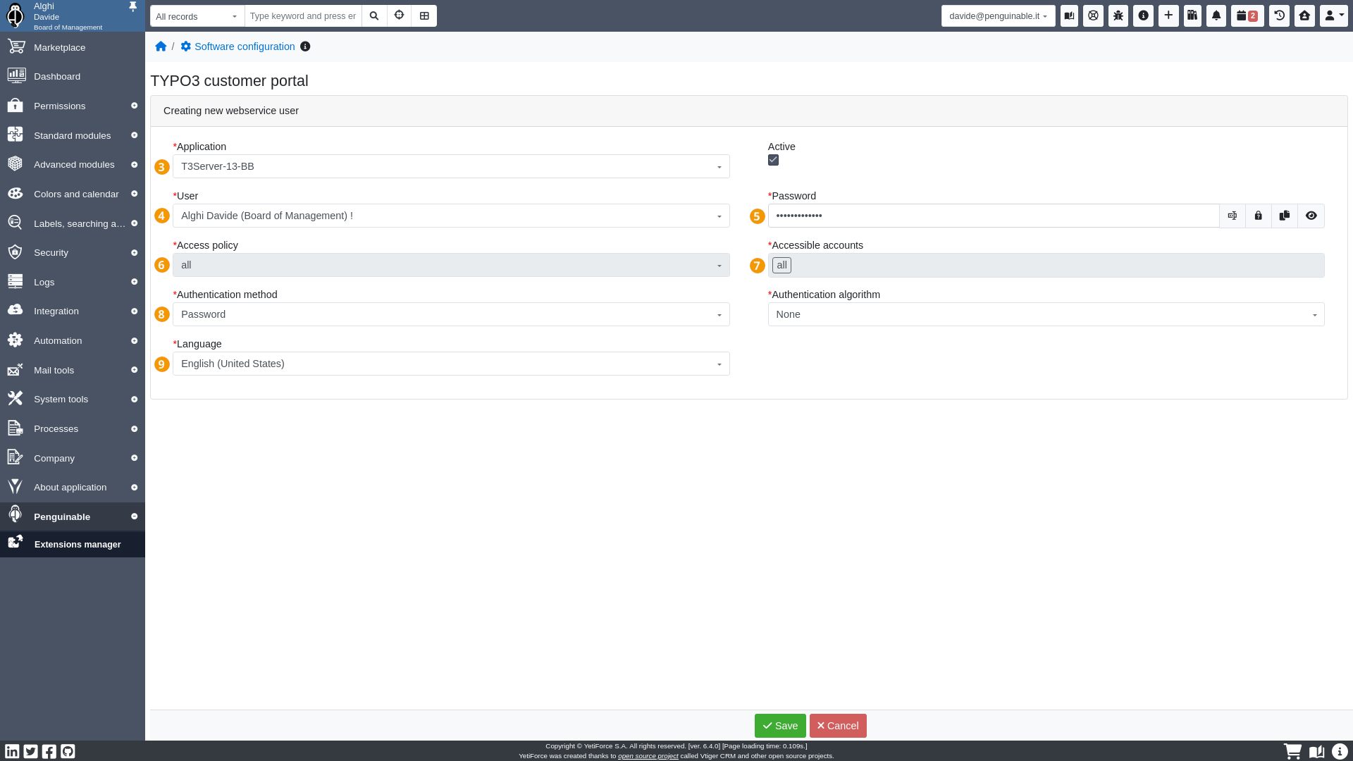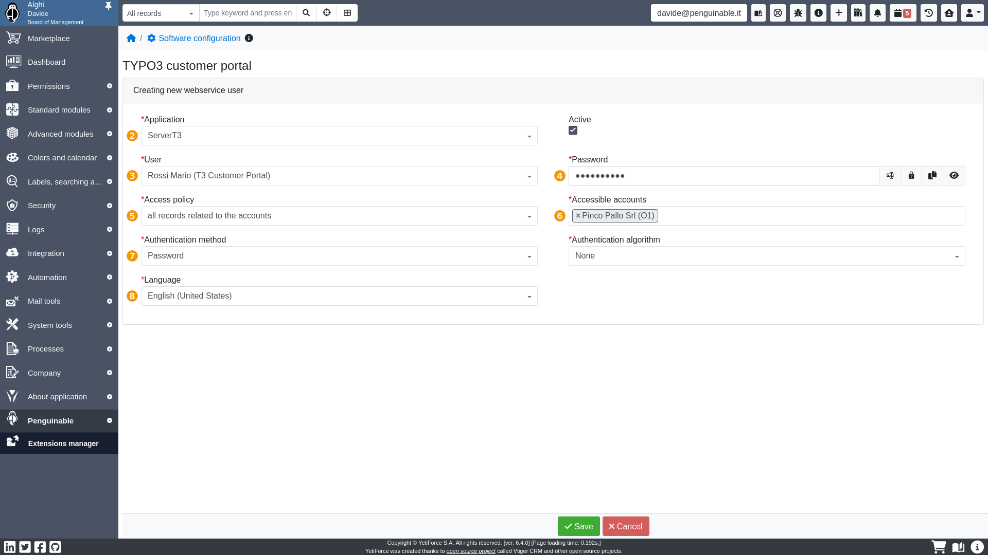 The webservice user record defines the credentials to connect to YetiForce Customer Portal.